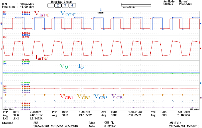 (Top) Proposed CISS-DAB converter topology. (Bottom) Experimental waveforms for CISS-DAB with output 1968 V at 4 kW from a 400 V input.