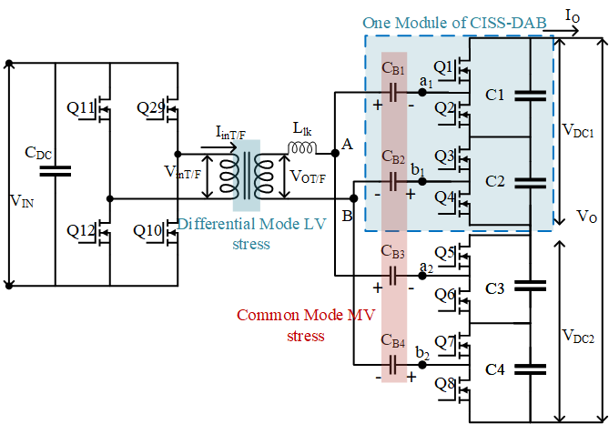 Researchers at NCPRE, IIT Bombay, have developed a novel DC-DC converter topology for medium-voltage DC applications aimed at improving the efficiency, power density, and scalability of grid-connected photovoltaic and MVDC power conversion systems. The research proposes a Capacitive Isolated Series Stacked Dual Active Bridge (CISS- DAB) converter topology that combines capacitive isolation with a series-stacked converter structure to achieve high voltage gain without requiring high turns-ratio transformers or multiple transformer windings. In a conventional medium-voltage DC-DC converter, transformer insulation requirements and high turns ratios significantly increase system size and complexity. The proposed topology addresses these challenges by using capacitors to block medium-voltage DC stress, while the series-stacked structure multiplies the output voltage. This reduces insulation stress on the medium-frequency transformer, decreases magnetic component size, and reduces the number of active switches, resulting in improved efficiency and higher power density. The proposed topology is validated using a 4 kW hardware prototype. Experimental results demonstrated efficiencies up to 98.4%, and reduced component count compared to conventional input-parallel output-series Dual Active Bridge converters. The topology also demonstrates scalability to higher voltage levels, making it suitable for medium-voltage photovoltaic inverters, solid-state transformers, and emerging MVDC distribution systems. This work carried out by Jenson Joseph Attukadavil and Prof. B. G. Fernandes was presented at the 2025 IEEE Energy Conversion Conference Congress and Exposition (ECCE), Philadelphia, PA, USA.