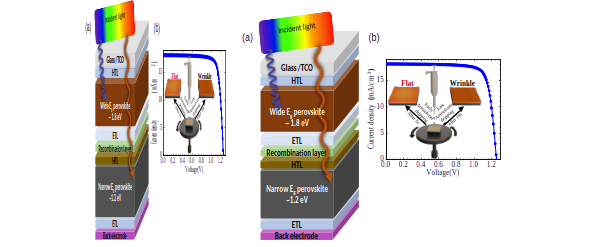 Wide band gap (WBG) perovskite solar cells are a key element for all perovskite tandem solar cells, multi-junction space PV, and transparent PV technological applications. WBG perovskites with band gaps ~1.8 eV are particularly promising as top absorbers with a narrow band gap ~1.2 eV in all perovskite tandem Solar Cells architectures, enabling optimal spectral utilization and unlocking pathways to exceed the Shockley–Queisser efficiency limit of single- junction devices. Certified efficiencies of all-perovskite tandem solar cells have surpassed 31%, with a reported record of 31.38% efficiency. To achieve the band gap ~1.8 eV, FA/Cs-based perovskites with compositions Cs0.17FA0.83Pb(I0.6Br0.4)3 are widely employed. This requires incorporating a high Br fraction, which strongly affects the crystallization process and hinders the control of film morphology and (b) optoelectronic quality. In Br-rich perovskites, variations of only a few seconds in processing parameters lead to pronounced changes in semiconductor quality and device performance. Early antisolvent dripping (5 s after spin initiation) yields flat films with microcracks, whereas delayed dripping (10 s) results in a wrinkled morphology. Comprehensive structural, optical, and electrical analyses reveal that wrinkled films exhibit enhanced crystallinity, reduced defect activation energy, and suppressed nonradiative recombination. Temperature- dependent photoluminescence shows lower activation energies for wrinkled films, indicating improved carrier transport. Importantly, scanning photocurrent microscopy provides direct spatial evidence of morphology-controlled lateral charge transport, demonstrating significantly longer electron and hole transport lengths in wrinkled films compared to flat counterparts. Further enhancement is achieved through interfacial passivation, which extends lateral transport lengths and reduces interfacial recombination losses. As a result, wrinkled and passivated devices achieve power conversion efficiencies up to 18.54% with reduced voltage losses. These findings establish a direct correlation between morphology, interfacial quality, and charge transport in WBG perovskites, highlighting morphology engineering as a powerful strategy for advancing all perovskite tandem solar cells. Details of this work have been published in Jana, S.; Singha, A.; Singh, M. K.; Nayak, S.; Laxmi, L.; Bhardwaj, B.; Balasubramaniam, K. R.; Kabra, D., “Correlation of Morphology and Interface Properties with Charge Transport in Wide Band Gap Perovskite Solar Cells,” ACS Energy Lett. 2025, 11 (1), p. 799.