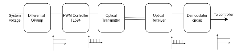 Cascaded H-Bridge converters are extensively used for medium voltage grid integration in solar energy systems. To ensure reliable operation of converter under the varying grid voltage conditions closed loop operation is essential. A key element of this control strategy is accurate voltage sensing, which enables safe scaling from high system voltages to controller-level signals while maintaining required electrical isolation. For the designed H-Bridge, which is the basic building block for Cascaded H-Bridge, voltage sensing is performed using a differential amplifier, and a modulator circuit is employed to convert the sensed voltage signal into PWM pulses. These PWM pulses are then transmitted to the controller board using AFBR series optical transmitters and receivers. A low-pass demodulator circuit is used after the receiver circuit to reconstruct the modulated signal, and the output of the demodulator is connected to the ADC pin on the microcontroller for closed-loop operation. Scaling from system level voltage to controller level is achieved by using a differential amplifier, which is realised by using TLV2372ID op-amp. Conversion of low voltage signal to PWM signal is achieved by using TL594 PWM controller IC. Isolation between the HV power and the LV controller is provided by using optical Tx-Rx system. The signal flow for the voltage sensing scheme is shown. This work was done by NCPRE student Kalyan under the guidance of Prof. B. G. Fernandes.